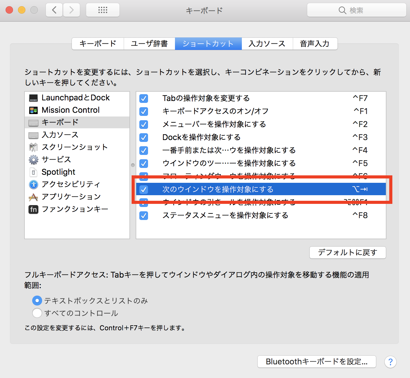システム環境設定 → キーボード → ショートカットタブの → キーボード の 次のウィンドウを操作対象にする