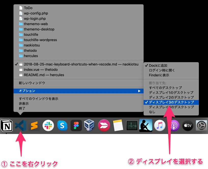 VSCodeのアイコンを右クリック → オプション → まとめたいディスプレイを選択