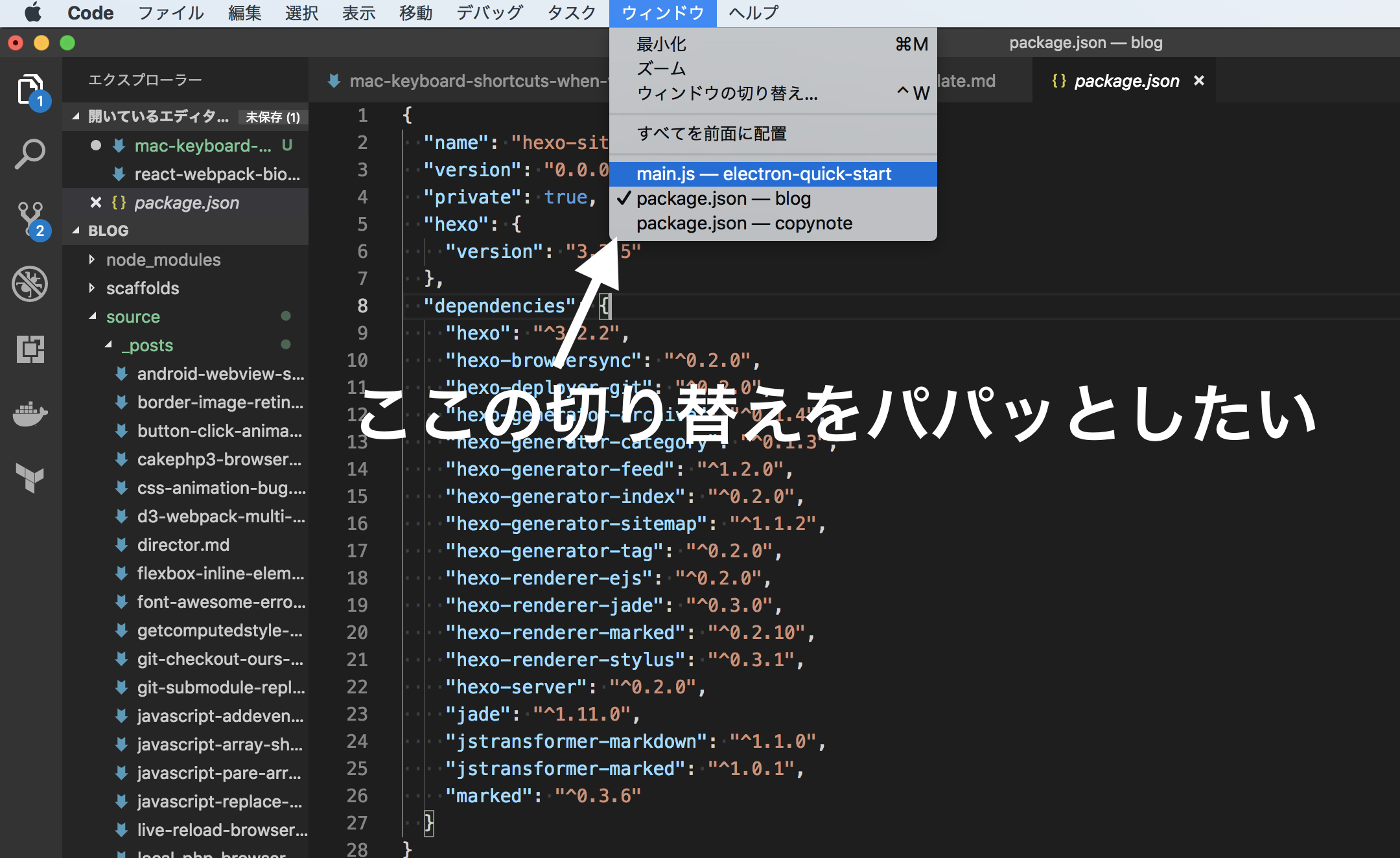VSCodeのウィンドウ(ワークスペース)を切り替えるショートカット - macOS