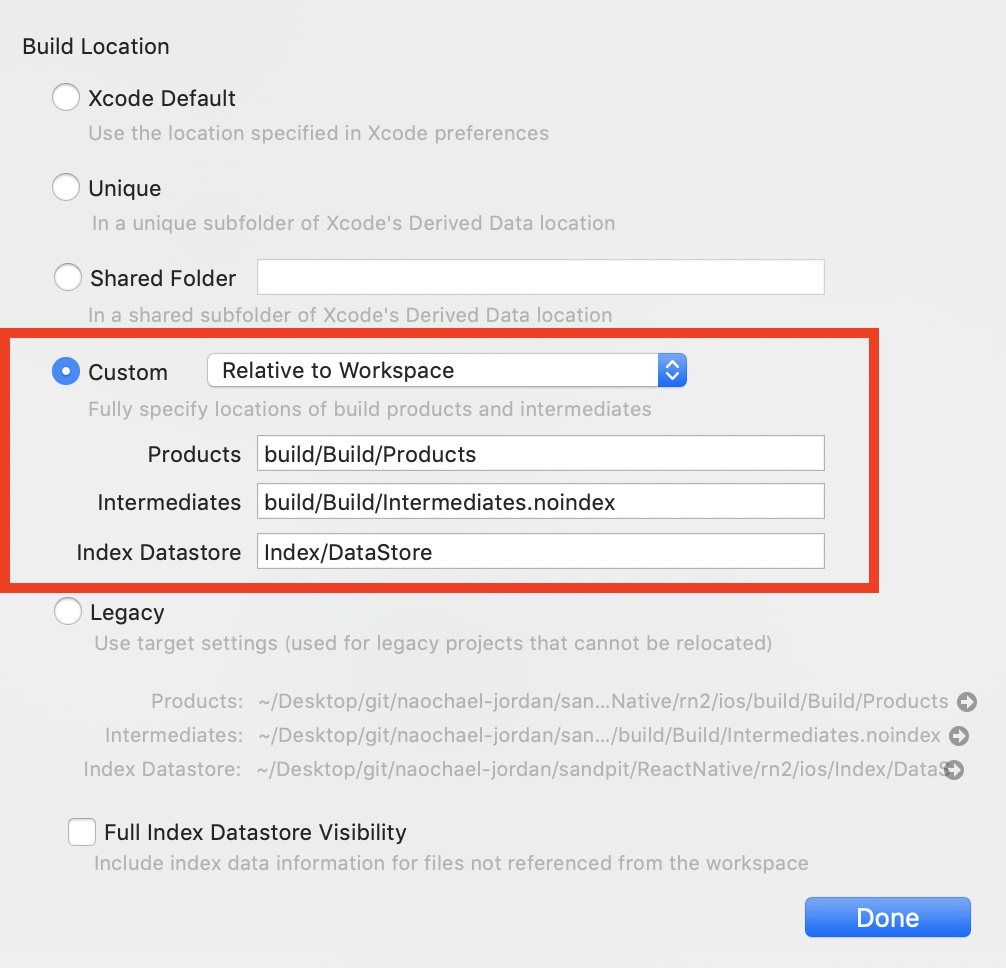 /ios/プロジェクト名.xcodeprojを Xcode で開いて、File → Project Settings のメニューの中から「Advanced」を選択して、下記のように設定すると良かった。